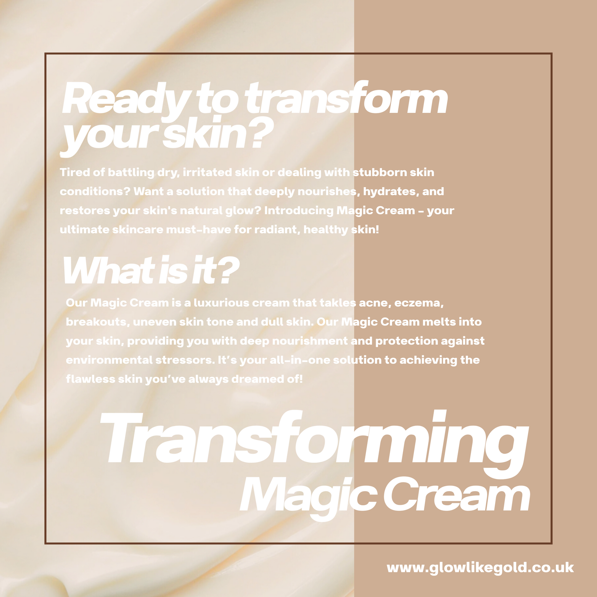a luxurious cream that tackles acne, eczema, breakouts, uneven skin tone and dull skin. Our Magic Cream melts into your skin, providing you with deep nourishment and protection against environmental stressors. It’s your all-in-one solution to achieving the flawless skin you’ve always dreamed of!